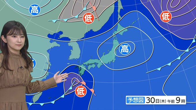 30日(木)は、前線を伴った低気圧が西から近づき、西日本は、朝の通勤・通学の時間帯は広い範囲で本降りの雨となりそうです。
