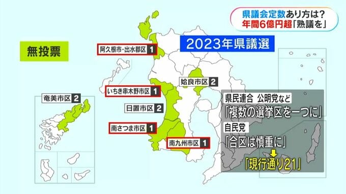 前回の県議選では、7つの選挙区で合わせて10人が無投票当選となりました。7選挙区のうち4つが1人区で、県民連合や公明党などは複数の選挙区を1つにする案を主張。一方の自民党からは慎重な意見が出て、21の現行通りとすることが決まりました。