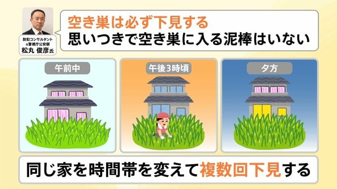 防犯コンサルタントで元警視庁公安部の松丸俊彦氏によると、「空き巣は必ず下見する。思いつきで空き巣に入る泥棒はいない」ということです。