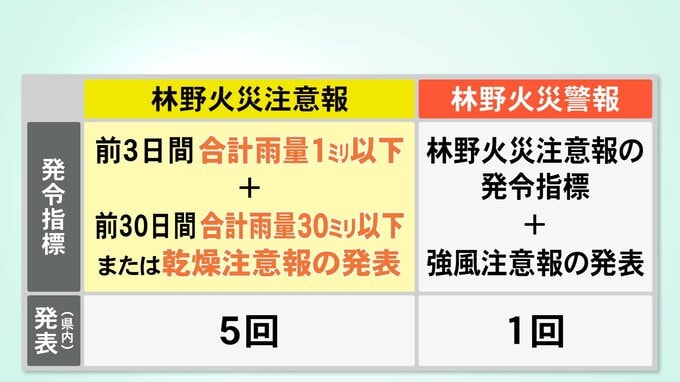 「前日までの3日間の合計降水量が1ミリ以下」といった複数の気象条件を満たした場合に発令され、県内でもすでに発表された日があります。
