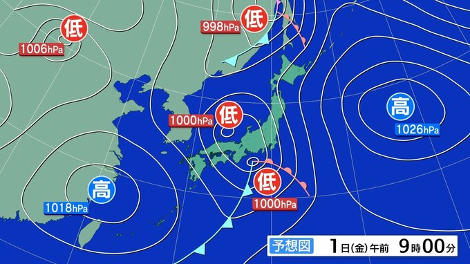また、1日は、西日本から東日本の上空約5500メートルには、氷点下21度以下のこの時期としては強い寒気が流れ込む見込みです。このため、南西諸島、西日本、東日本では、大気の状態が非常に不安定となるということです。