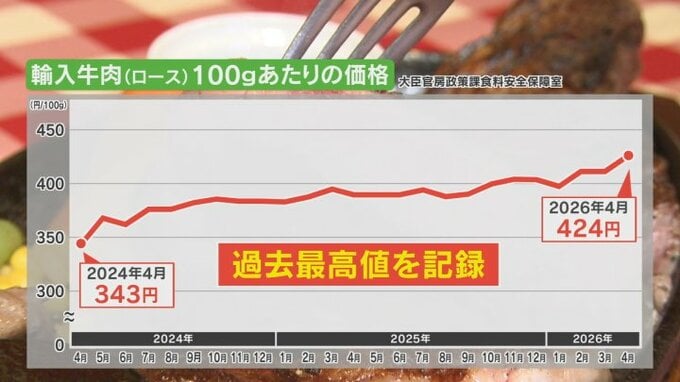 店では、アメリカ産やニュージーランド産の牛肉を使用していて、およそ4年前と比べて仕入れ価格が6割上昇。