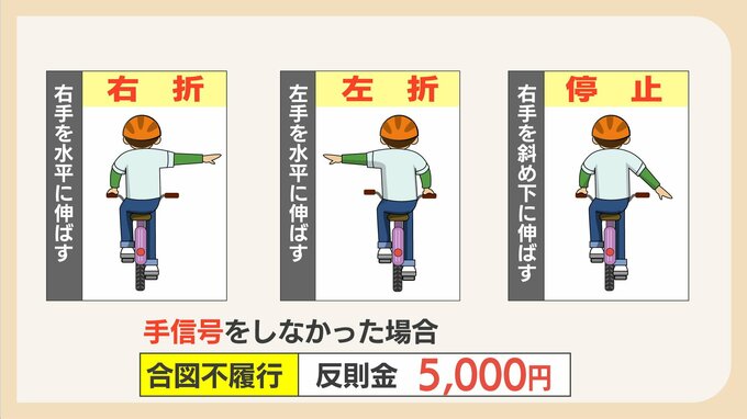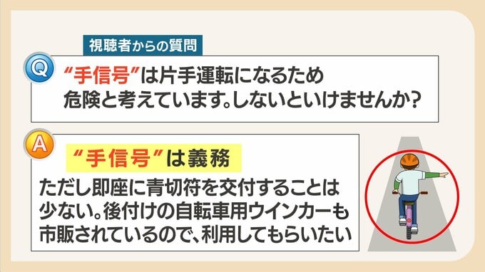 「手信号は義務。ただし即座に青切符を交付することは少ない。後付けの自転車用ウインカーも市販されているので利用してもらいたい」