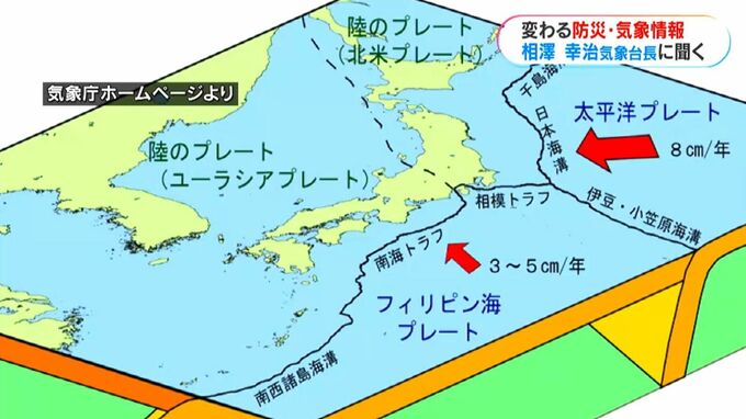 (相澤台長)「県内には非常に多くの活火山が、桜島、諏訪之瀬島とございます。また鹿児島の東側にはプレートが沈みこむ海溝がありまして、ここでも巨大地震が日向灘で起きています。
