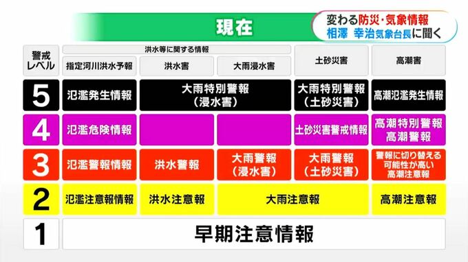 これが新しい情報では、河川氾濫、大雨、土砂災害、高潮の4つのカテゴリーに分類。注意報、警報のほかに「危険警報」も加わって、5段階の警戒レベルに対応する形に整理されます。