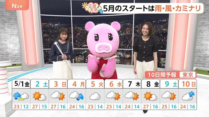 5月1日の関東の天気を山形純菜キャスター、坂口愛美気象予報士がお伝えします。・雨のピークは朝と夜2回・雨の日 暑い日…忙しいGWの天気・5月のスタートは雨・風・カミナリ