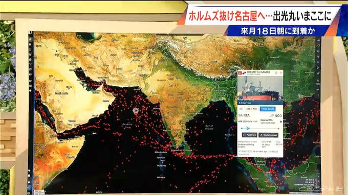 ホルムズ海峡を通過したタンカー「出光丸」 5月に名古屋へ なぜ通過できた?今後の見通しは? CBCテレビ 2026年4月30日(木) 19:45 国内 「出光丸」はいまどこに?5月に名古屋へ では、この出光丸は今どこにいるんでしょうか。現状を見てみましょう。 今はインドの西側にいます。ホルムズ海峡からずいぶん来ました。名古屋に向かっていて、5月18日に日本に到着するということなんです。