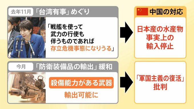 最近の事例だと、4月21日に防衛装備品輸出の大幅緩和が決定し、殺傷能力がある武器を輸出できるようになりました。これを受け、中国政府は「軍国主義の復活だ」と批判しています。