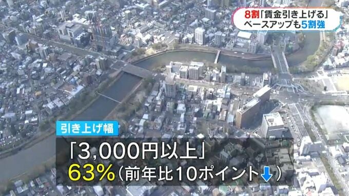 基本給を引き上げるベースアップについて、実施すると答えた企業は去年より5ポイント増えて56%でした。ただ、「3000円以上引き上げる」と答えた企業は63%と、去年の調査から10ポイント減っていて、上げ幅は緩やかになっているということです。