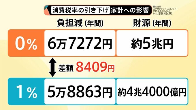 野村総研 エグゼクティブ・エコノミストの木内登英氏によると、消費税0%と1%で、年間の家計への負担減少額を試算すると、差額は8400円くらいになるということです。