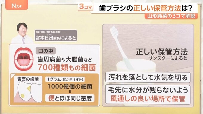 まず、歯ブラシの保管方法についてです。幸町歯科口腔外科医院の宮本日出院長によると、そもそも口の中は、歯周病菌や大腸菌など700種類もの細菌が発生しています。