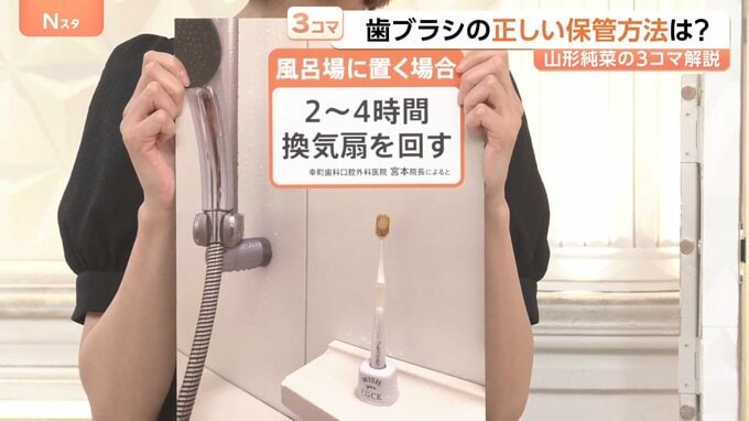 お風呂場で歯ブラシを保管している人も多いかもしれませんが、宮本院長いわく、湿気は大敵です。もしお風呂場に置く場合は、換気扇を2~4時間回して湿気を飛ばすようにとのことでした。