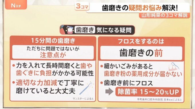 続いて、フロスをするタイミングですが、宮本院長いわく、歯磨きの前がおすすめだと言います。細かいごみが歯の間にあると、歯磨き粉の薬用成分が届かないため、歯磨き前にフロスをすると除菌率が15~20%上がるとのことです。