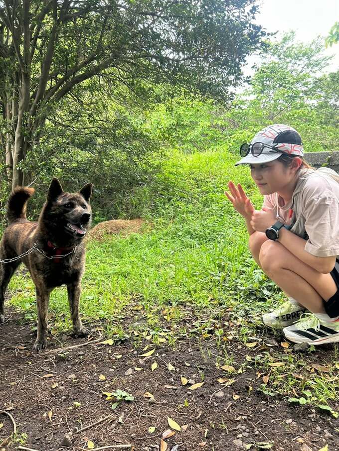 タレントの井上咲楽さんが、トレイルラン練習中に出会った犬との2ショット写真を投稿しています。