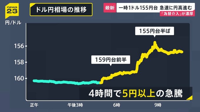 4月30日、1ドルが160円台後半から5円以上、急激な円高に。政府による「為替介入」の可能性が濃厚です。夕方、1年9か月ぶりに1ドル=160円台後半まで進んだ円安。流れが一転したのは午後5時前のことです。片山さつ…