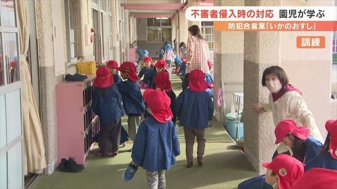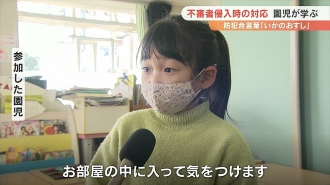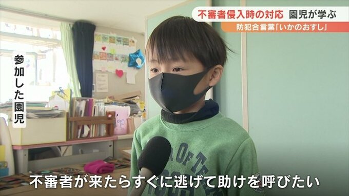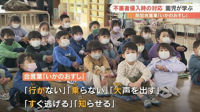 園児たちは不審者に遭遇した際は「イカない」「ノらない」など犯罪に巻き込まれないための合言葉「いかのおすし」を学びました。