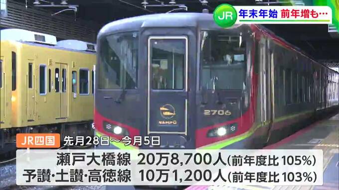 JR四国では、瀬戸大橋線が20万8700人で前年度比105%となり、予讃・土讃・高徳の主要3線区も10万1200人で、103%となっています。