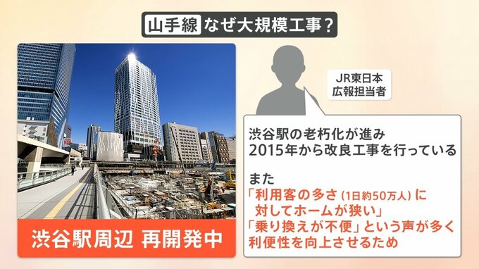 渋谷駅の老朽化が進み、2015年から改良工事を行っています。また「利用客の多さ(1日約50万人)に対してホームが狭い」「乗り換えが不便」という声が多く、利便性を向上させるため今このような工事が行われ続けているということです。