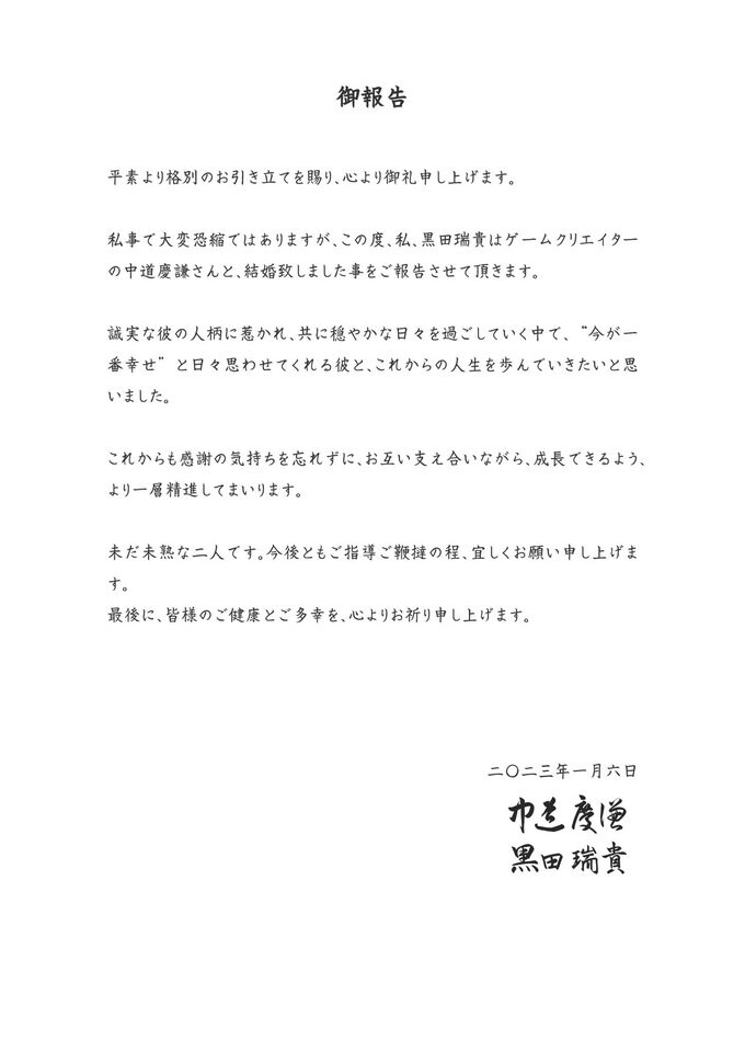 私事で大変恐縮ではありますが、 この度、私、黒田瑞貴はゲームクリエイターの中道慶謙さんと結婚致しました事をご報告させて頂きます。