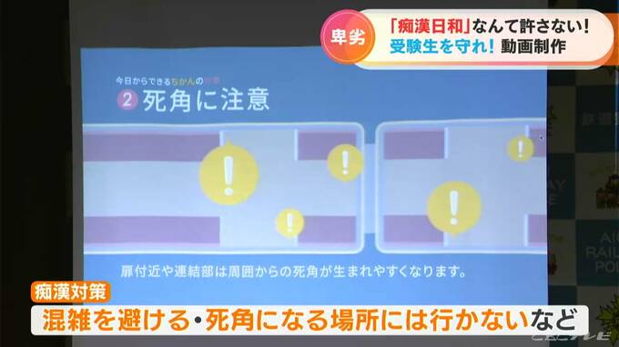 痴漢から身を守るための動画を制作。混雑を避け、車両の奥など死角になる場所にはいかないように呼びかけます。