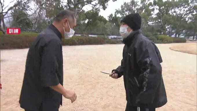 2022年、令和の大改修を終えた岡山城です。110番の訓練には、観光ボランティアら約55人が参加しました。天守閣前の広場で不審者が刃物を振り回したとの想定で行われ、緊迫した場面でも正確に状況を伝えるなど、警察官が犯人を確保するまでの対応を訓練しました。