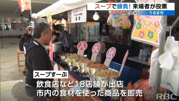 うるま市の会場には飲食店など18の店舗が出店し、温泉卵が丸々1つ入ったクリームスープや、揚げ菓子が入れ放題のスープなど市内の食材を使ったオリジナルの商品を即売しています。