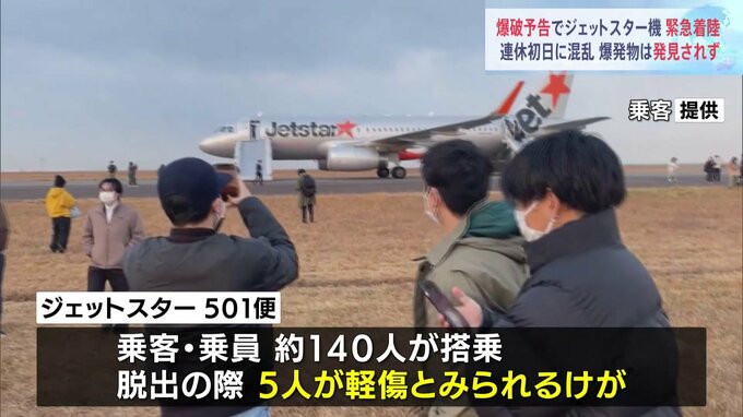 けさ、成田から福岡に向かっていたジェットスター機に爆破予告があり、中部空港に緊急着陸しました。爆発物はみつかりませんでした。記者「午後2時前です。緊急着陸した便に乗っていたとみられる乗客が到着ロビー…