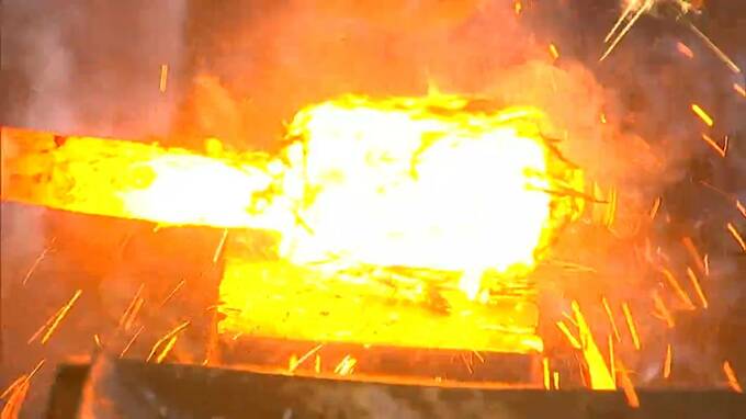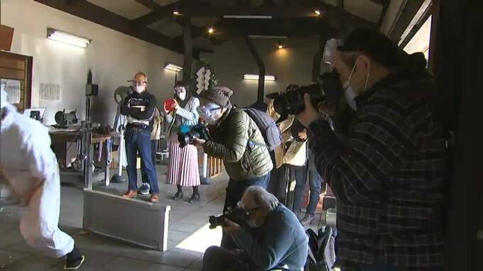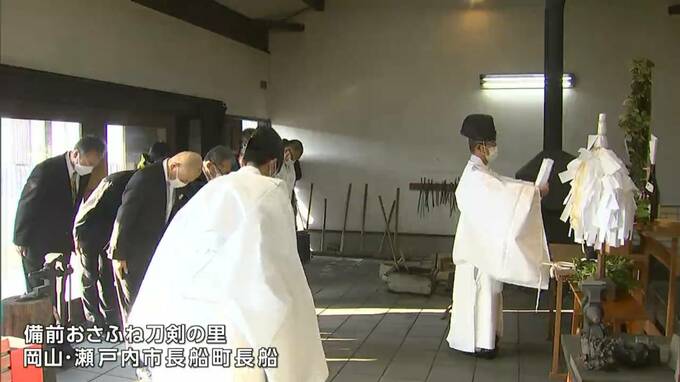 毎年この時期に行われている打初式です。備前おさふね刀剣の里で普段から作業をしている職人7人と関係者が参加し、刀づくりに使う道具や鋼を熱する火床をはらいました。また熱した鋼を大槌で叩く昔ながらの作業も今年初めて公開され、事前予約した観衆が見守りました。