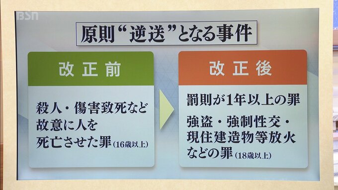 これまでは殺人や傷害致死など故意に人を死亡させた事件などが原則的に『逆送』の対象となっていましたが、4月1日からはその対象が拡大され、強盗や強制性交・現住建造物等放火など、罰則が1年以上の罪にあたる事件も含まれることになりました。