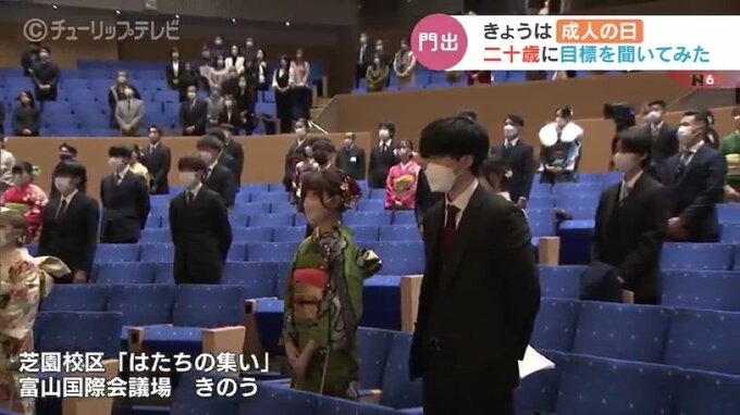 富山市の富山国際会議場では、今年度20歳を迎える芝園校区の77人が出席、それぞれの目標に向け気持ちを新たにしました。