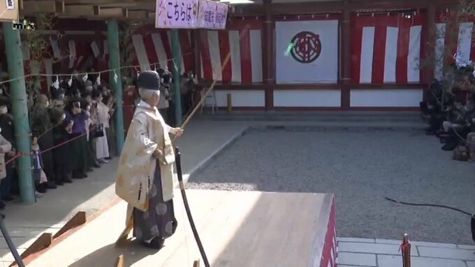 2002年からは、未来を担う若者を激励しようと20歳になる人も参加していて、「成人の日」の恒例となっています。宮司と20歳の男女5人が12メートル先にある「邪」と書かれた直径1メートル10センチの的を狙いました。