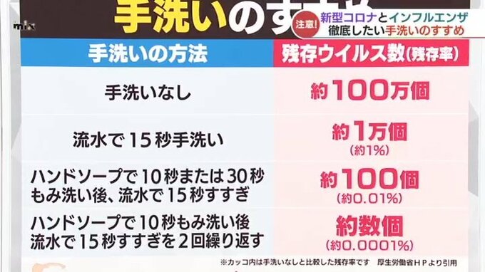 ただしウイルスが手に付着しただけでは感染しない。その手で口や鼻、目などの粘膜に触れることで感染します。