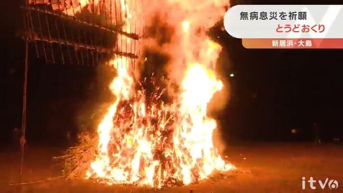 正月のしめ飾りなどを焼いて、1年の無病息災を願う伝統行事「とうどおくり」が9日、愛媛県新居浜市沖の大島で行われ、訪れた人たちは、勇壮な火祭りを堪能しました。「とうどおくり」は、新居浜市の大島で3…