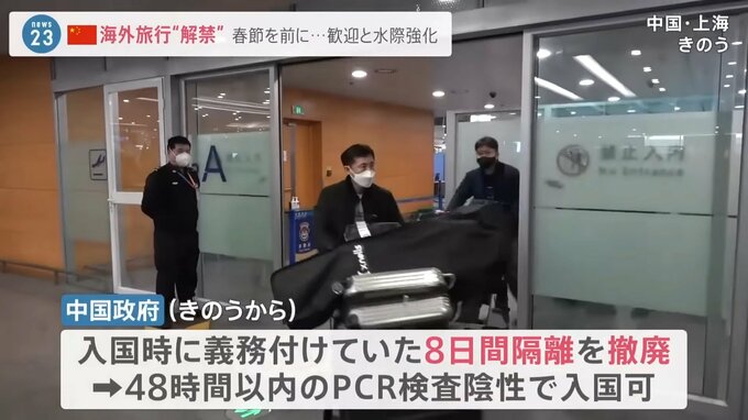 ゼロコロナ政策終了の“ひずみ”が顕わになる一方、日常を取り戻した人たちも。中国政府は、これまで入国の際に義務づけていた8日間の隔離を1月8日から撤廃。48時間以内のPCR検査で陰性であれば入国できるようになりました。