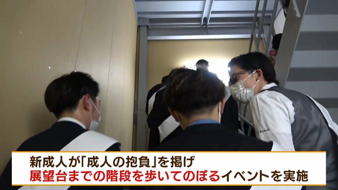 成人の日の1月9日、大阪市阿倍野区のあべのハルカスでは、新成人が「成人の抱負」を掲げて、地上60階にある展望台まで階段を歩いてのぼるイベントが行われました。