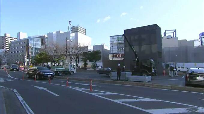 JR岡山駅東口の駅前広場では、工事関係者が平面駐車場を封鎖するためのフェンスを立てました。