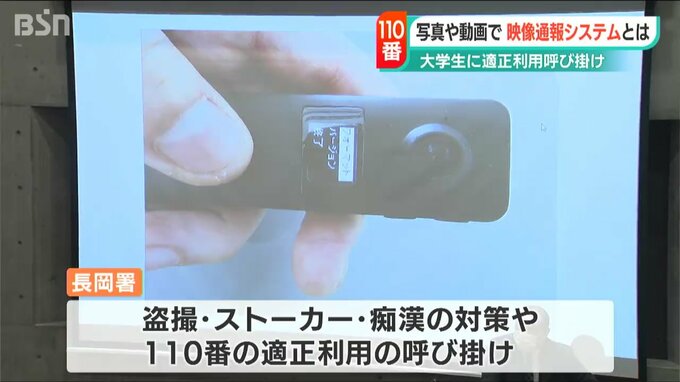 110番の日に合わせて長岡警察署が、110番に関する講座を新潟県の長岡造形大学で開き、盗撮・ストーカー・痴漢被害に遭わないための対策と、110番の適正な利用を呼び掛けました。