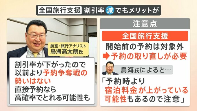 ただし注意点があるということで、今回の全国旅行支援は10日から予約再開ですので1月9日までに予約したものは、旅行の期間が10日以降であったとしても対象外になってしまいます。もしお得に旅行したいという場合は、予約の取り直しが必要になります。