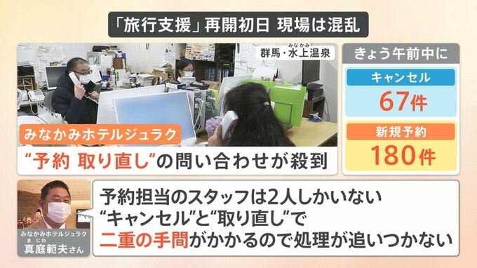 群馬・水上温泉 みなかみホテルジュラクさんでは、予約の取り直しの問い合わせが殺到しました。10日の午前中にキャンセルの電話は67件、再予約のものも含めて新規予約は180件。