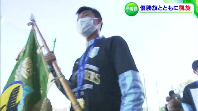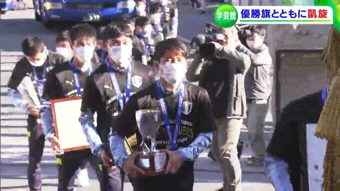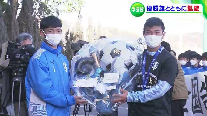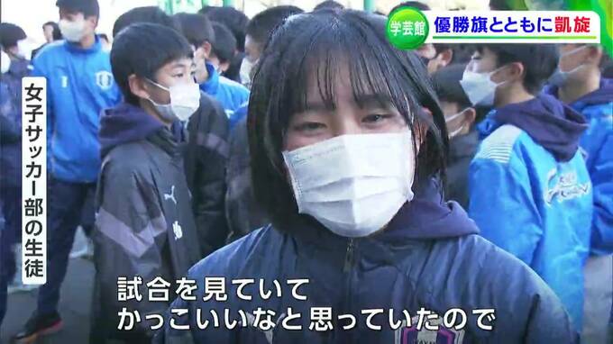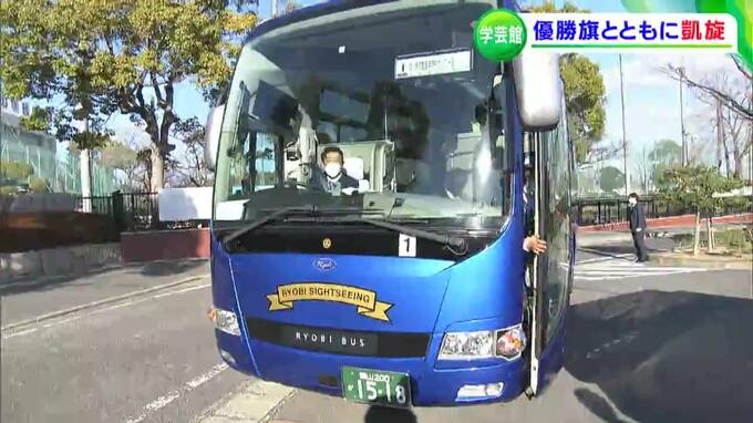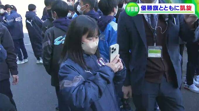 「今、学芸館高校のサッカー部員を乗せたバスが、学校に戻ってきました」