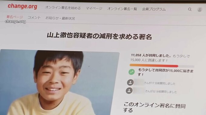 インターネット上では山上容疑者の減刑を求める署名サイトがあり、2023年1月10日午後10時時点で、1万1000人を超える署名が集まっています。