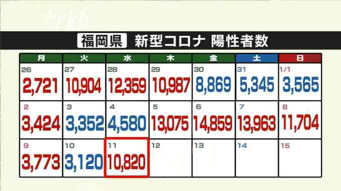 新型コロナウイルスの感染状況です。福岡県では11日、1万820人の陽性が確認され、一日あたりで過去最多の45人が亡くなりました。発表自治体別の陽性者の内訳は、福岡市が2914人、北九州市が175…