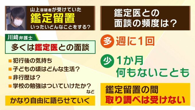 「多くは鑑定医との面談です。面談は山上容疑者がそもそも生まれてから犯行に至るまでどういった生い立ちだったのか、家族との関係はどうだったのか、学校ではどんな生活をしていたのか、犯行に至るときにどんな気持ちだったのか、それが終わった後にどういう気持ちでいるのかなどを鑑定医が聞き取る中で犯行時の精神状態を判断していくということになります」