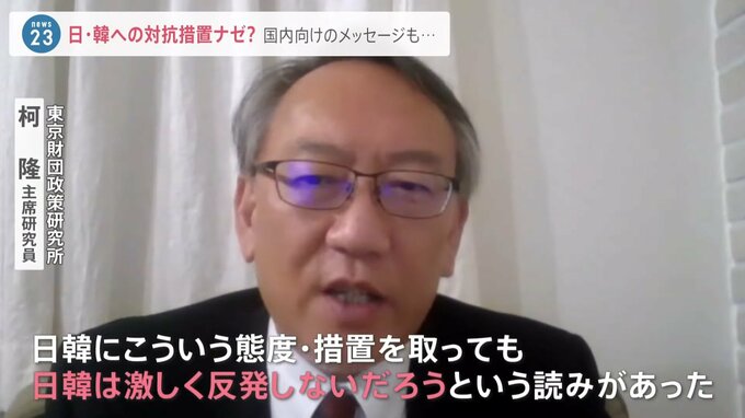 「なぜ日韓なのかというと、日韓にこういう態度・措置を取っても日韓は激しく反発しないだろうという読みがあったと思います。中国国内向けのメッセージとしては、弱腰外交をやらないというのが、一番の本音じゃないでしょうか」