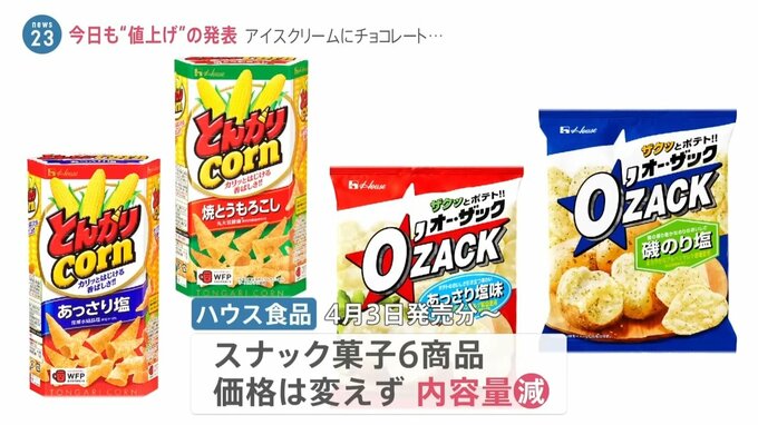 さらに、ハウス食品は4月3日の発売分からスナック菓子6商品について、価格は変えず内容量を減らして販売。