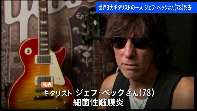 イギリスの伝説的ミュージシャンで3大ギタリストの1人と呼ばれたジェフ・ベックさんが亡くなりました。78歳でした。公式ウェブサイトなどによりますと、ベックさんは細菌性髄膜炎にかかり、10日、亡くなりました。…
