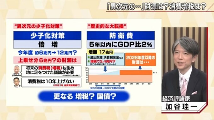 去年“歴史的大転換”と称された防衛費の倍増。具体的には5年間で約17兆円を捻出しなければならない。とりあえずこの5年分は歳出削減、決算余剰金など搔き集めた上に3.4兆の増税で目途をつけたが、2028年以降の財源は全く見えていない。にもかかわらず、年頭、岸田総理は“異次元”という金融緩和で使われた言葉を持ち出して少子化対策の予算倍増を打ち上げた。具体的金額は提示していないが、前年度実績から倍増と試算すると約12兆円くらいだろう。そして、これも財源は決まっていない。法人税か所得税か、はたまた赤字国債か?・・・