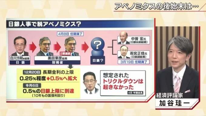 安倍カラーから少しずつ脱しつつある岸田総理。安倍政治の代名詞アベノミクスについて岸田総理は“トリクルダウンは起こらなかった”と期待した成果がなかったとも取れる発言をした。このアベノミクスの象徴ともいうべき人事、黒田東彦日銀総裁の任期が4月8日満了する。後任は、前副総裁の中曽宏氏と現副総裁の雨宮正佳氏のどちらかとされる。