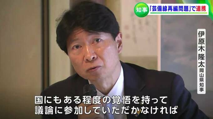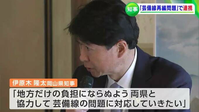 福山市の神勝寺で行われた両県知事会議では、芸備線の「新見市と広島県庄原市の一部区間」で議論されている再編問題などについて話し合われ、伊原木知事は、「広島県や沿線自治体と協力しながら、再編問題が地方だけの負担にならぬよう国の動きを注視したい」と述べました。