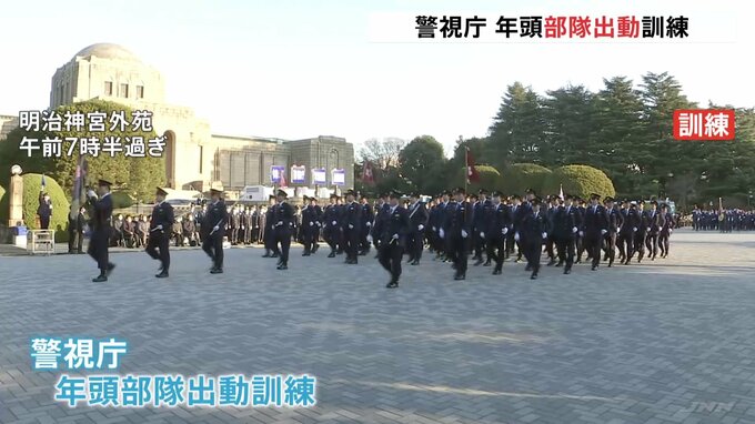 東京・新宿区の明治神宮外苑で、警視庁の「年頭部隊出動訓練」が行われました。午前7時半から行われた警視庁の「年頭部隊出動訓練」には、およそ1600人の警察官が参加し、機動隊を先頭にテロの初動対応にあたる銃…